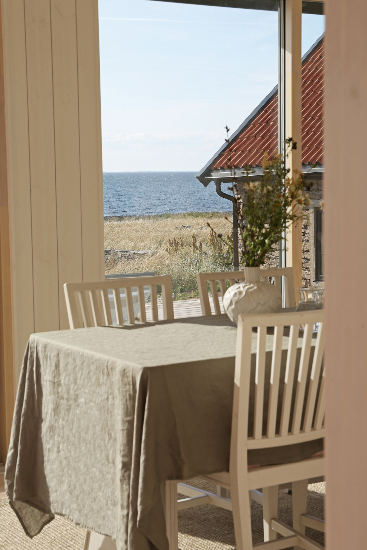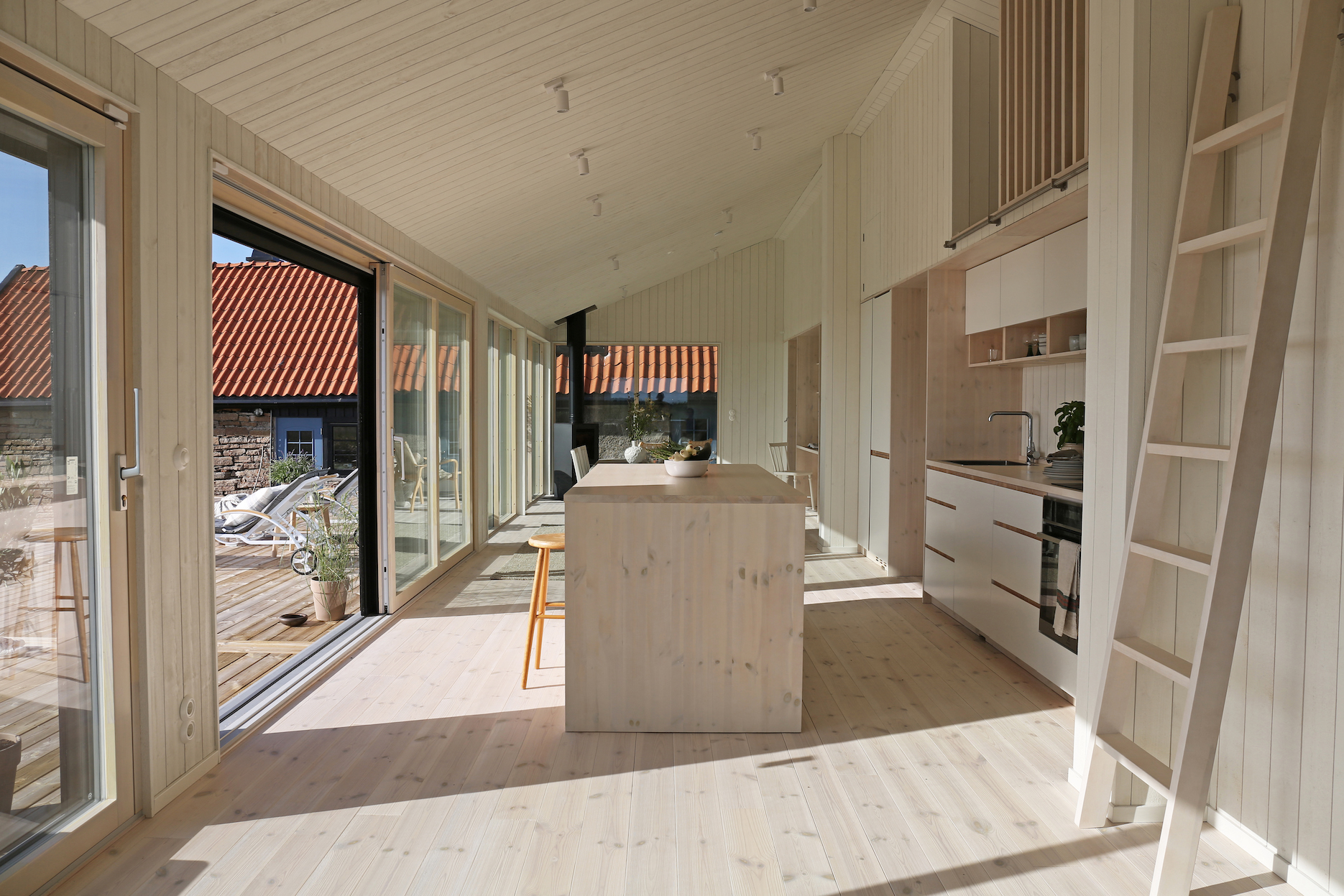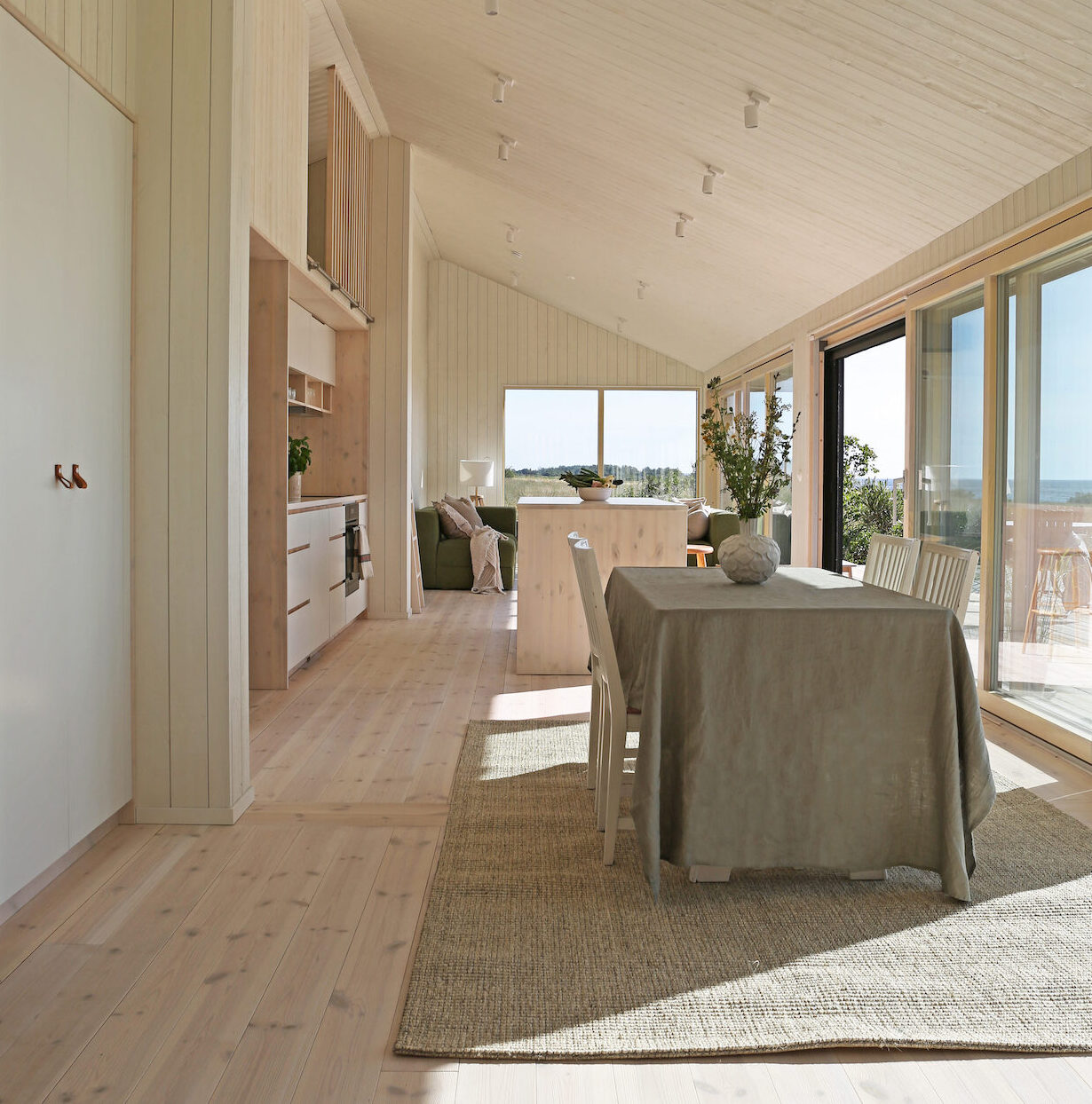 Det nya huset är noggrant planerat för familjens behov. Den öppna planlösningen på bottenvåningen inkluderar kök, vardagsrum och matplats som alla vetter mot vattnet. Sovrummen ligger diskret på husets baksida, barnen har fått egna rum och det finns även ett loft med extra sovplatser.