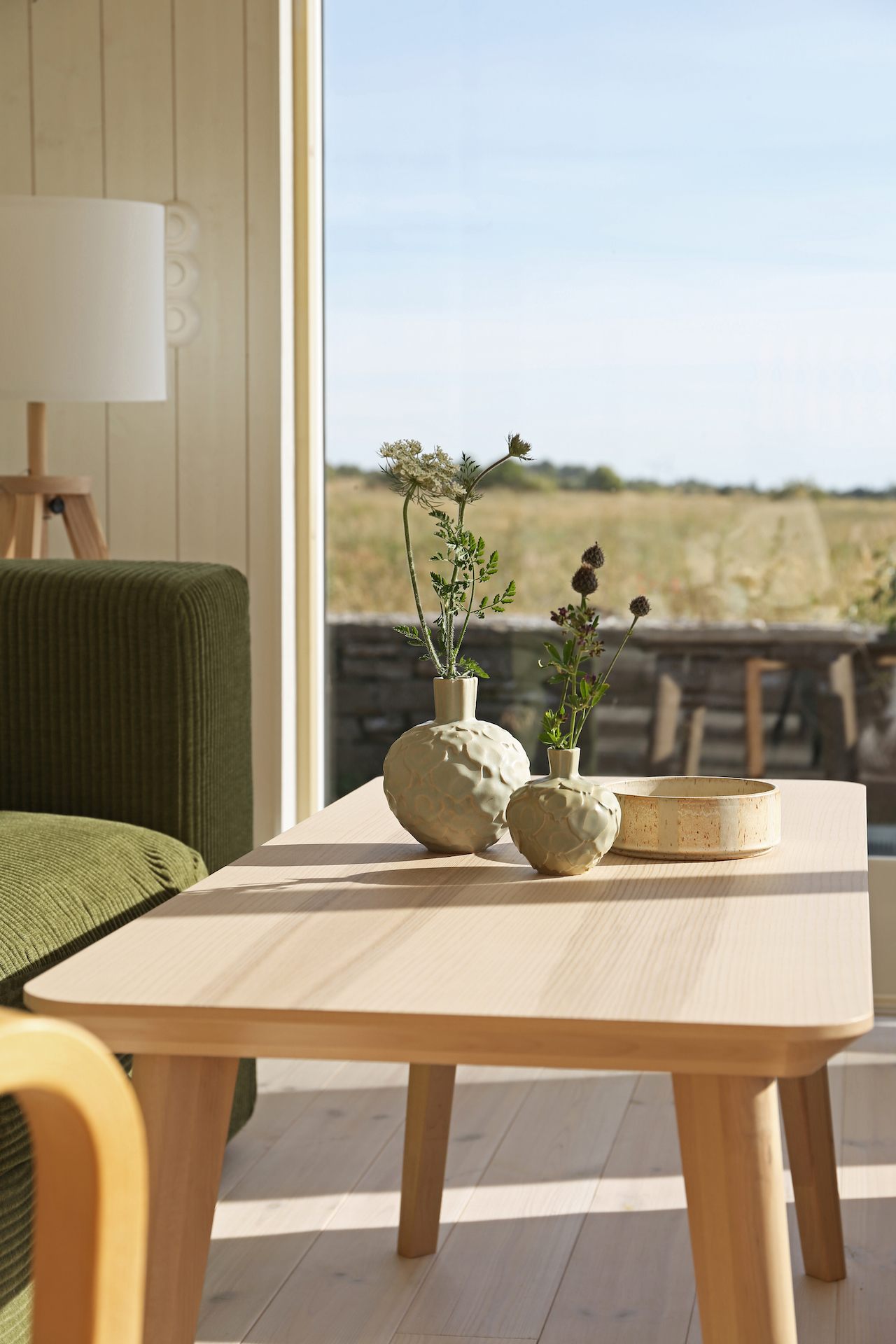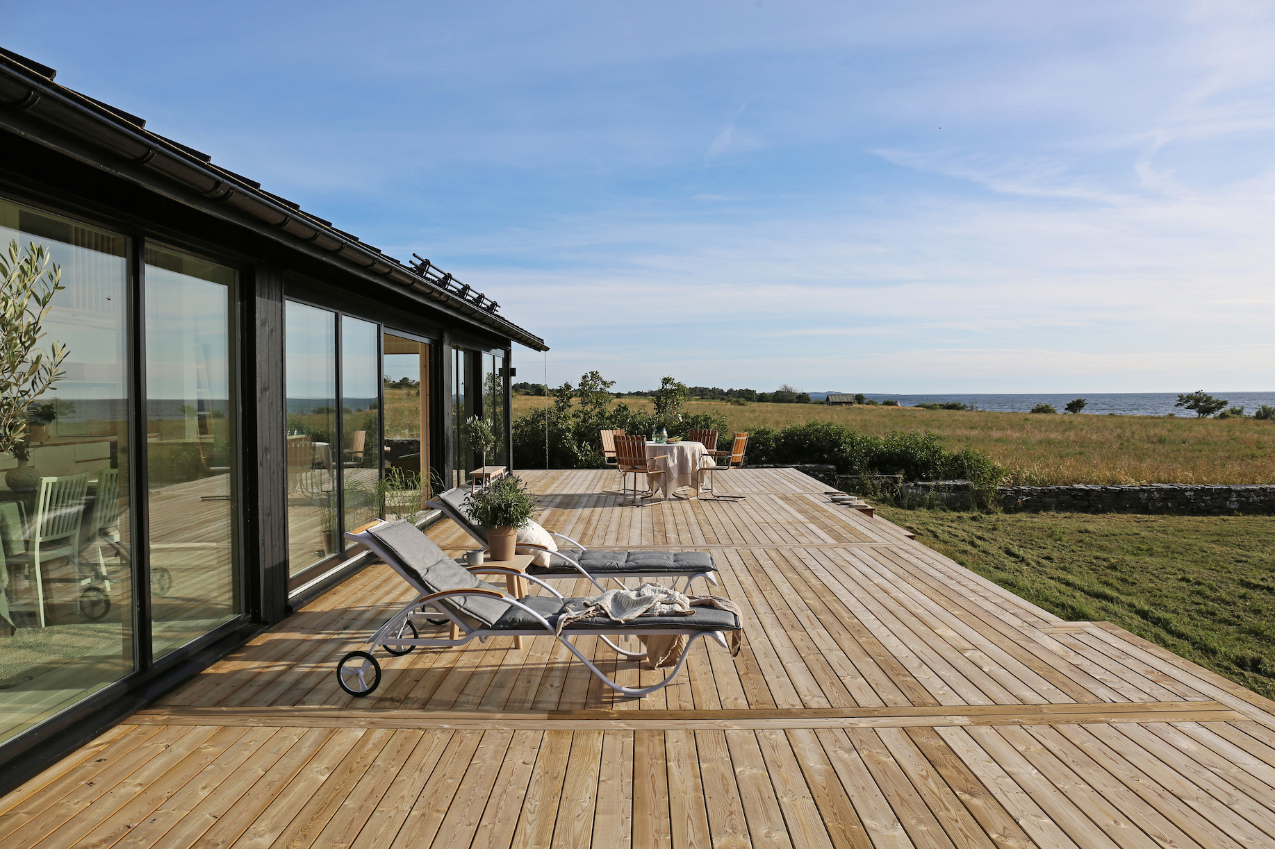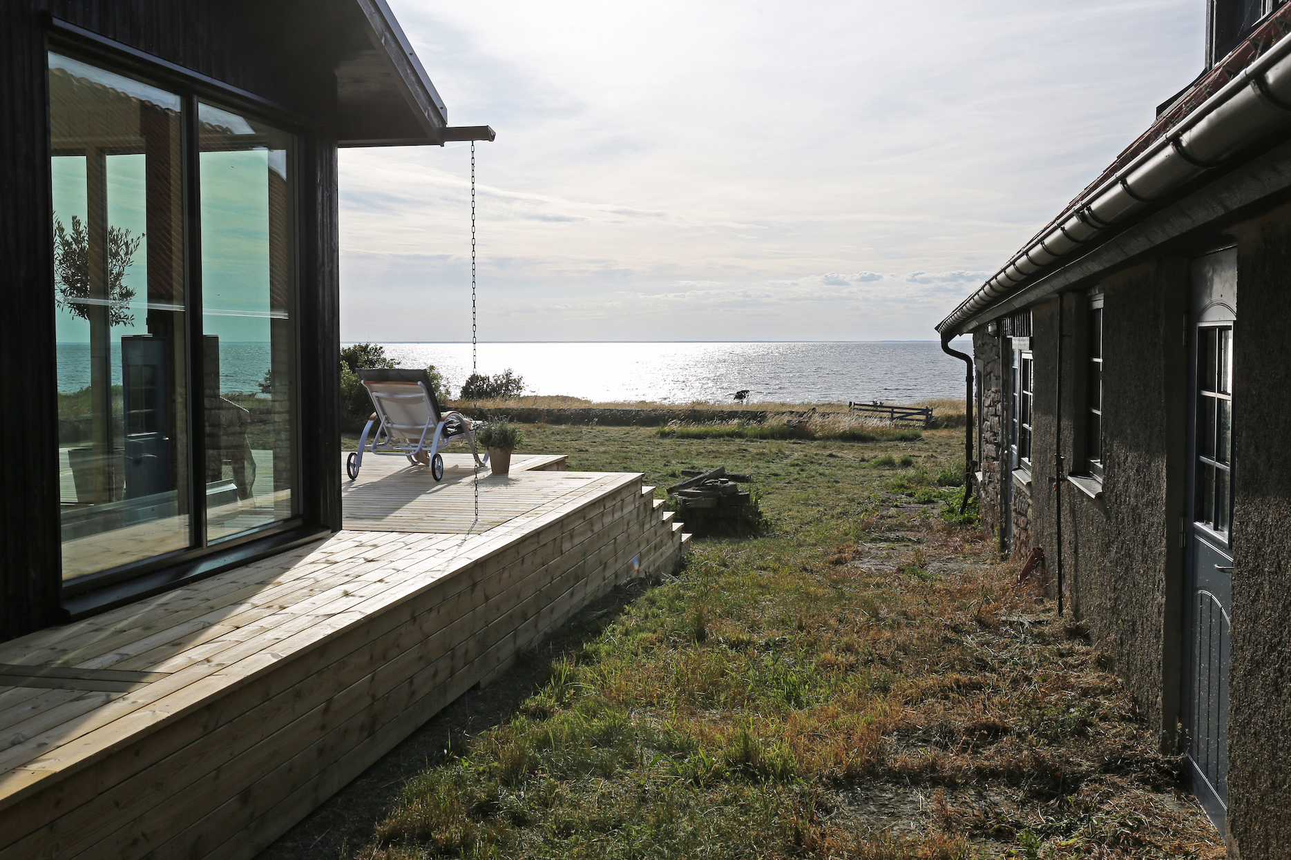 Utanför huset har familjen skapat olika zoner för avkoppling och aktiviteter. Terrassen fungerar som ett vardagsrum utomhus med utsikt över havet, och det finns planer på att bygga en pergola för skydd mot den intensiva ölandssolen. Den gamla stenladan som är ett av de två ursprungliga husen finns kvar och kommer att användas som gäststuga, medan det nya huset också planeras att hyras ut periodvis genom deras Instagram @cuteharbour.