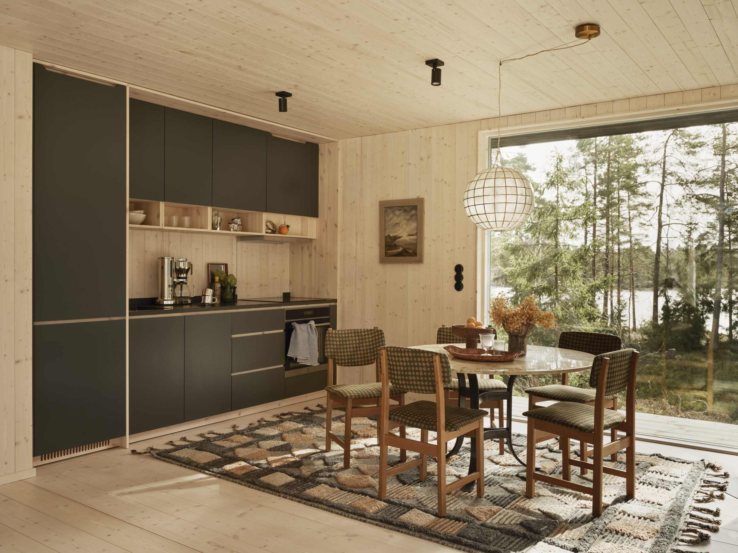 I det stora huset möts du av interiörstilen Varm, med massiv vitpigmenterad gran i golv, väggar och tak. Attefallshuset har interiörstilen Lugn, med väggar och tak i massiv finsågad panel samt vitvaxat trägolv.