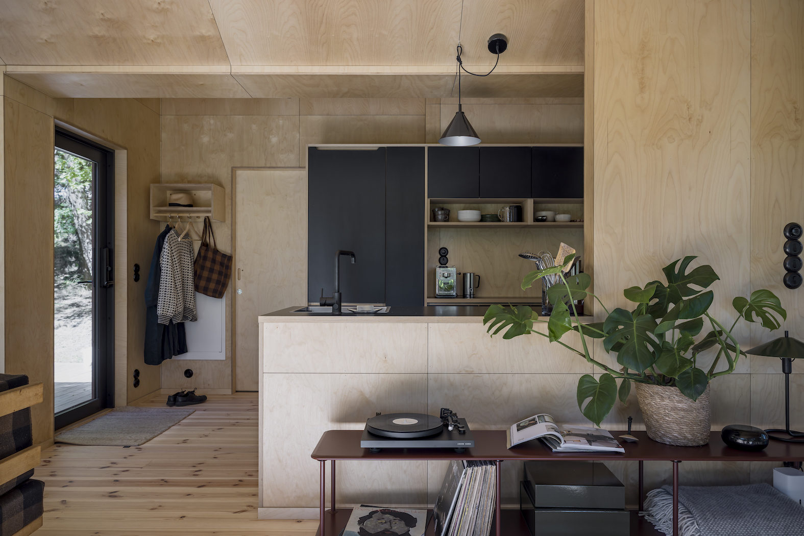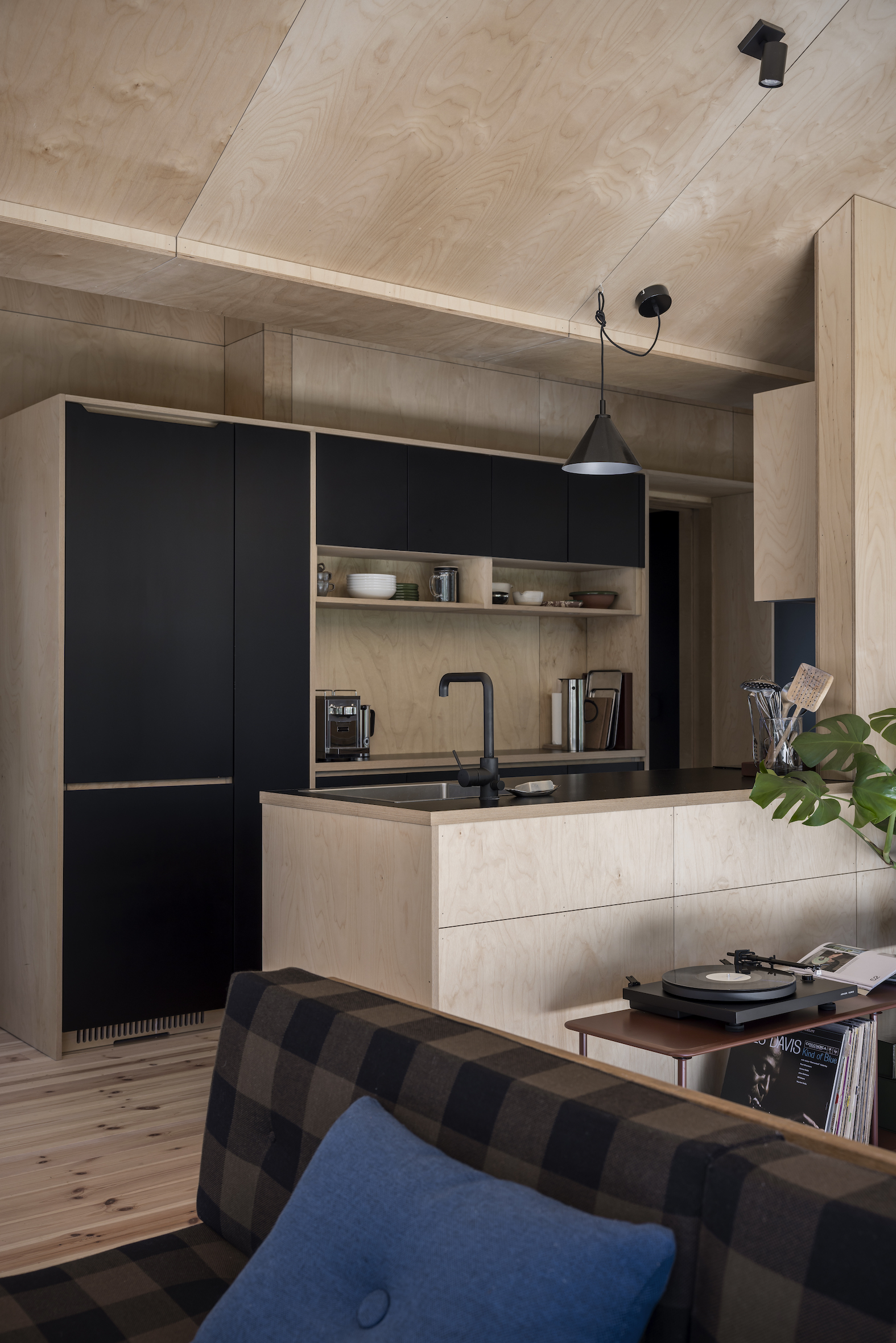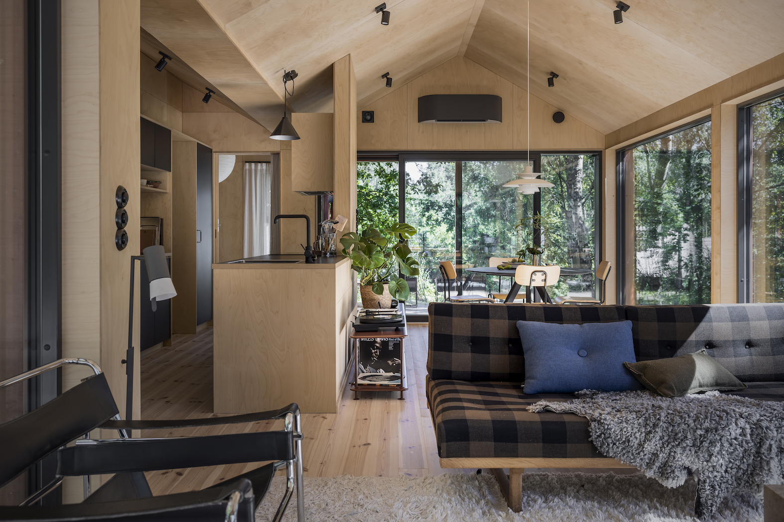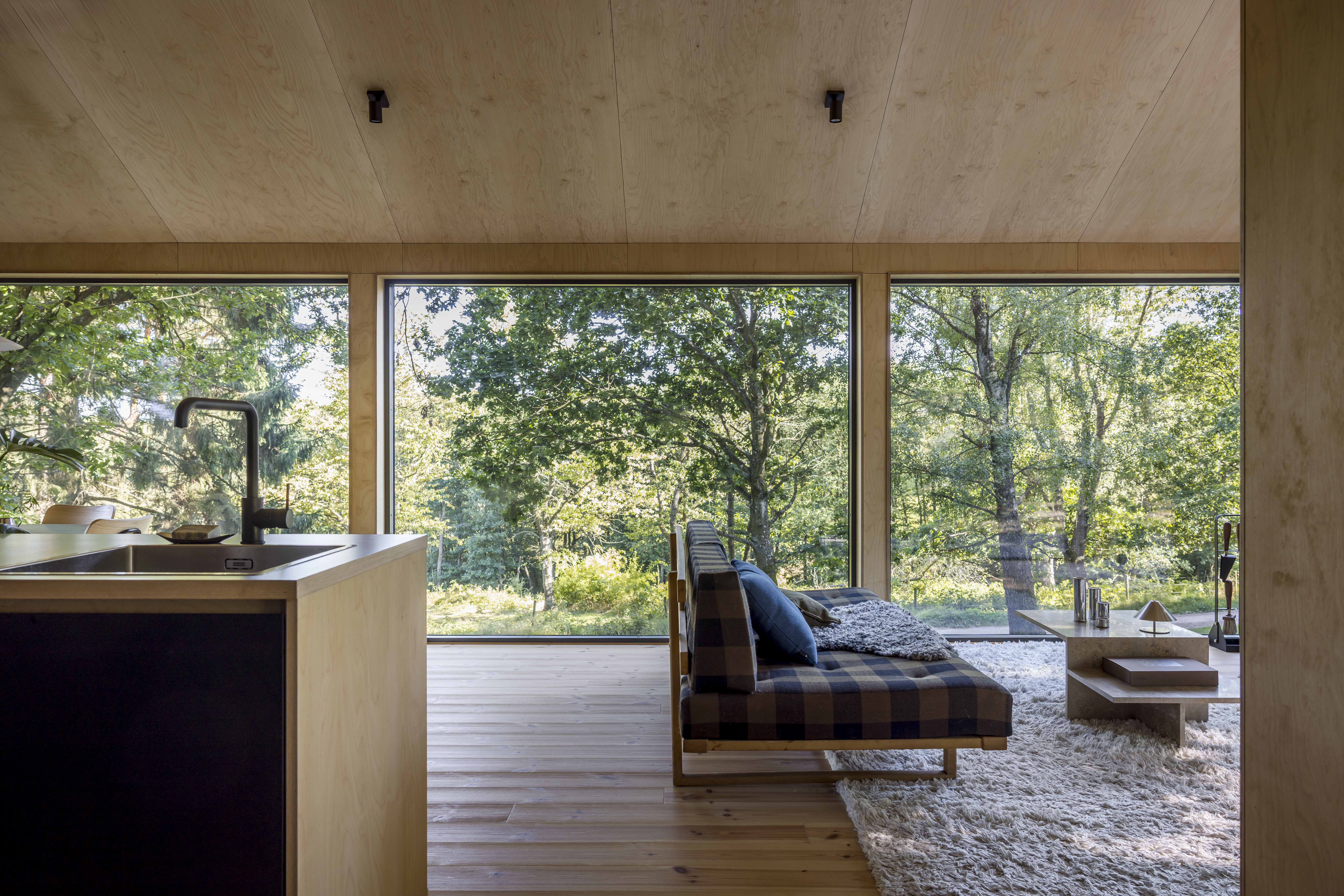 Huset har interiörstil Rå med vägg och tak i björkplywood behandlad med mattlack. På golvet ligger en massiv borstad furutilja behandlad med naturlig hårdvaxolja. Köket i mattlackad björkplywood med luckor och lådfronter i järnoxidsvart.