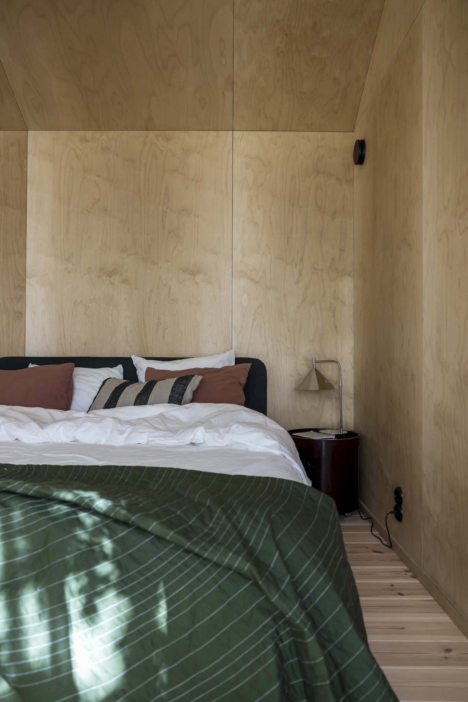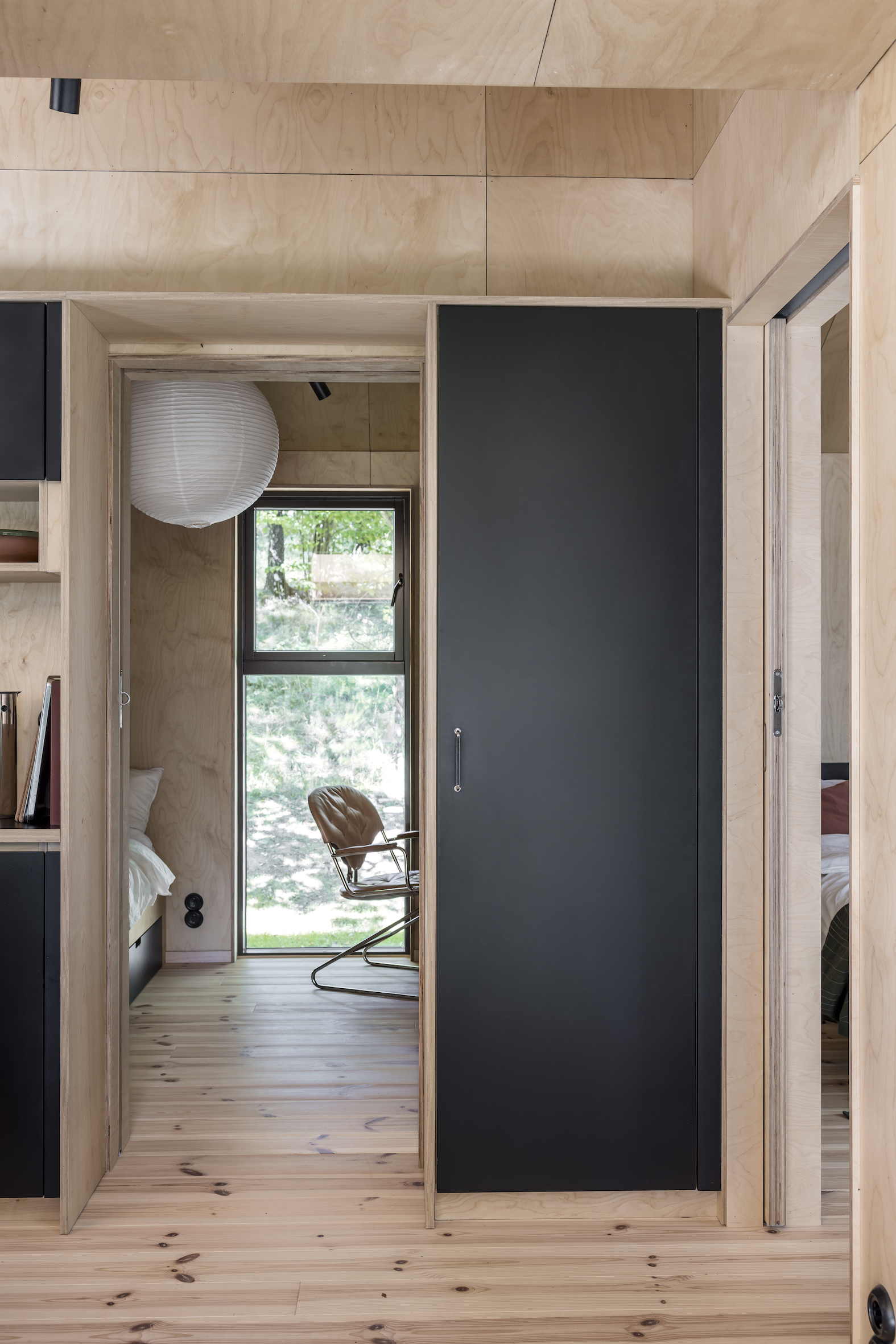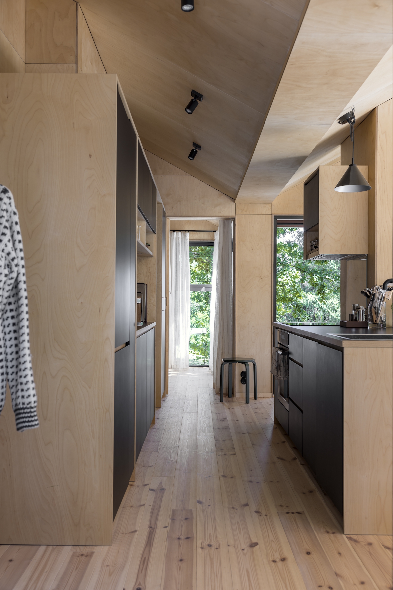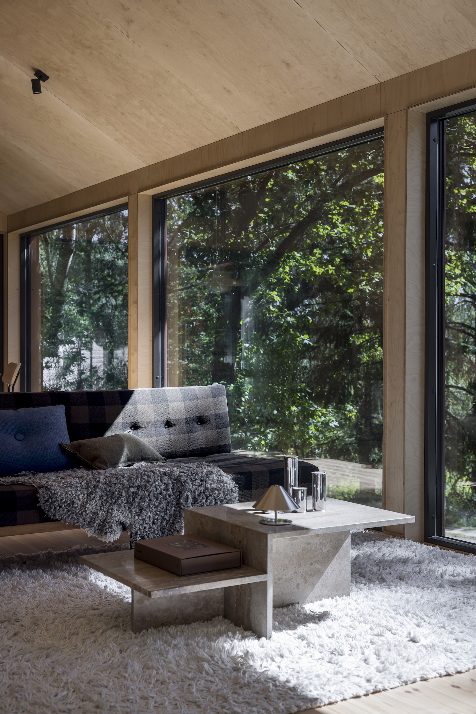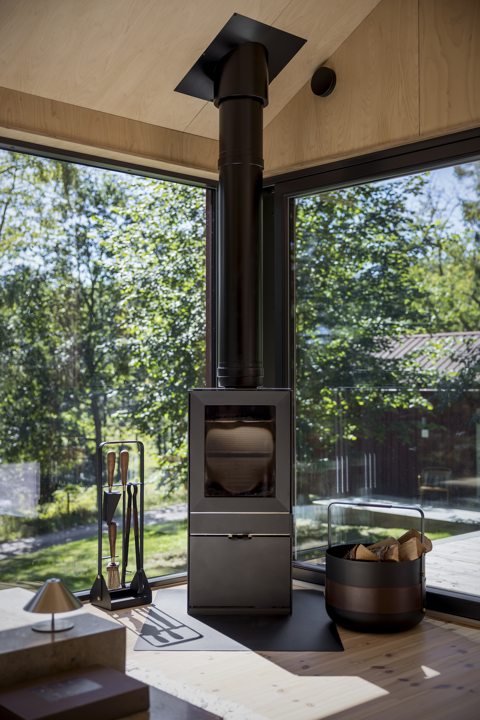 Huset har interiörstil Rå med vägg och tak i björkplywood behandlad med mattlack. På golvet ligger en massiv borstad furutilja behandlad med naturlig hårdvaxolja. Köket i mattlackad björkplywood med luckor och lådfronter i järnoxidsvart.