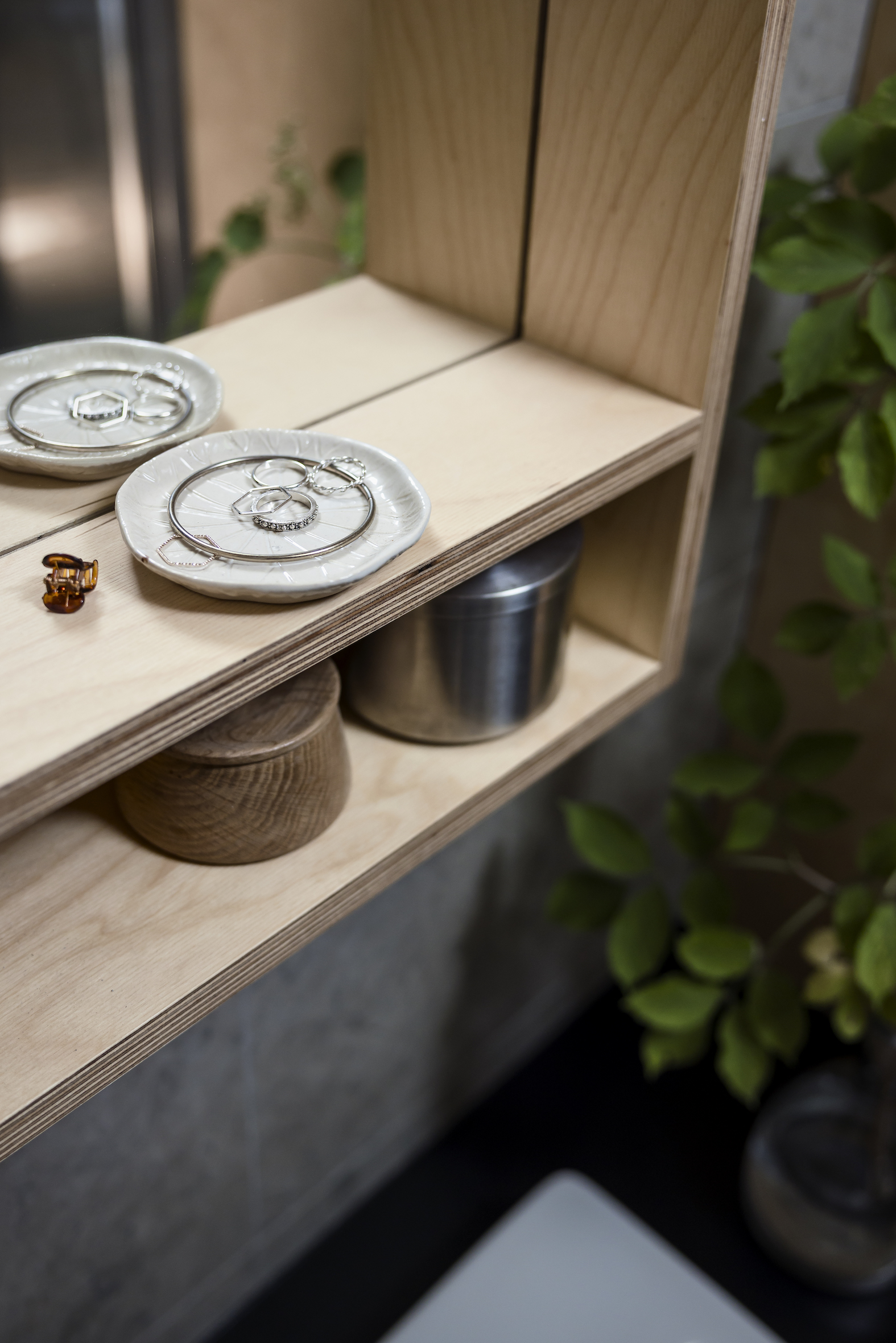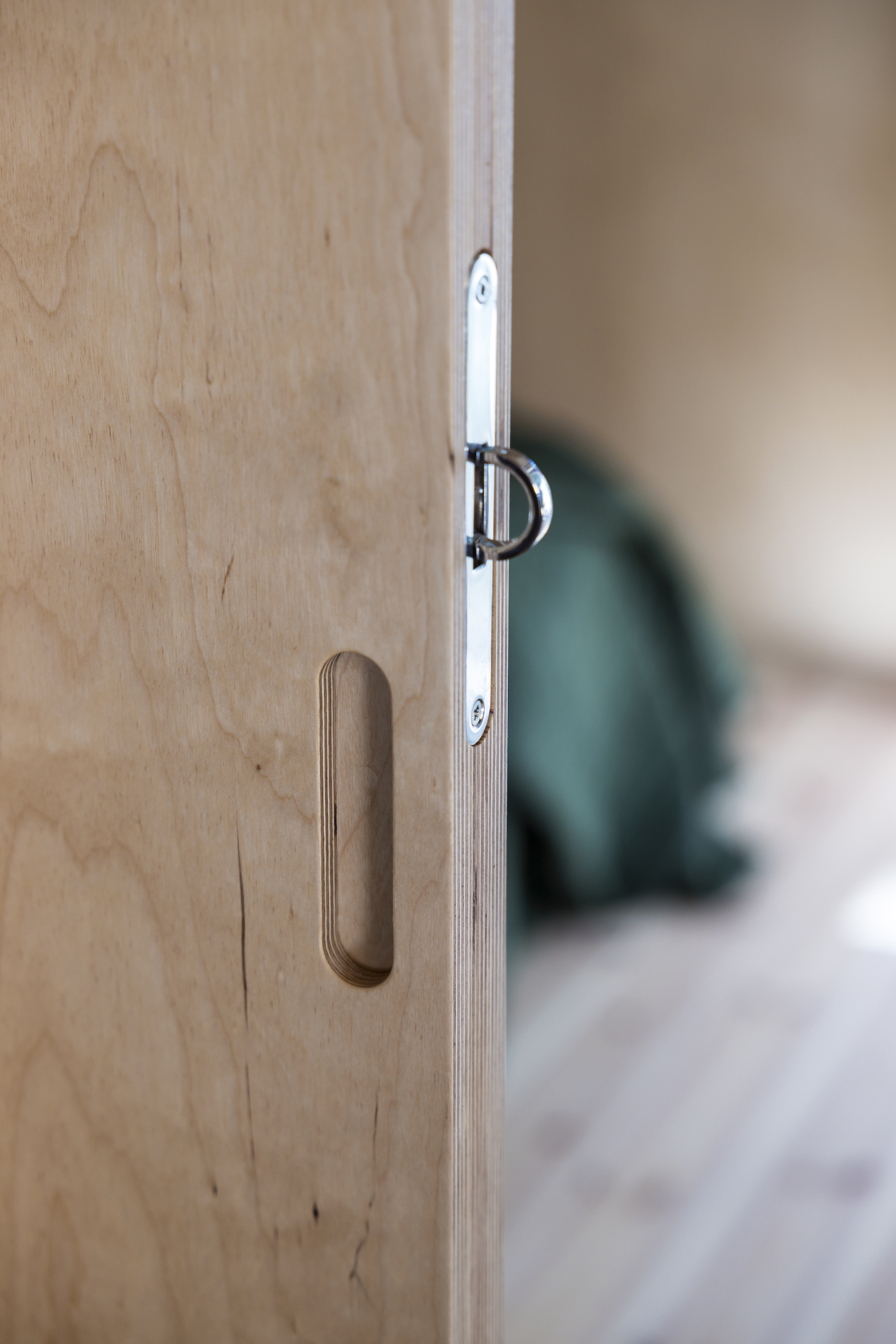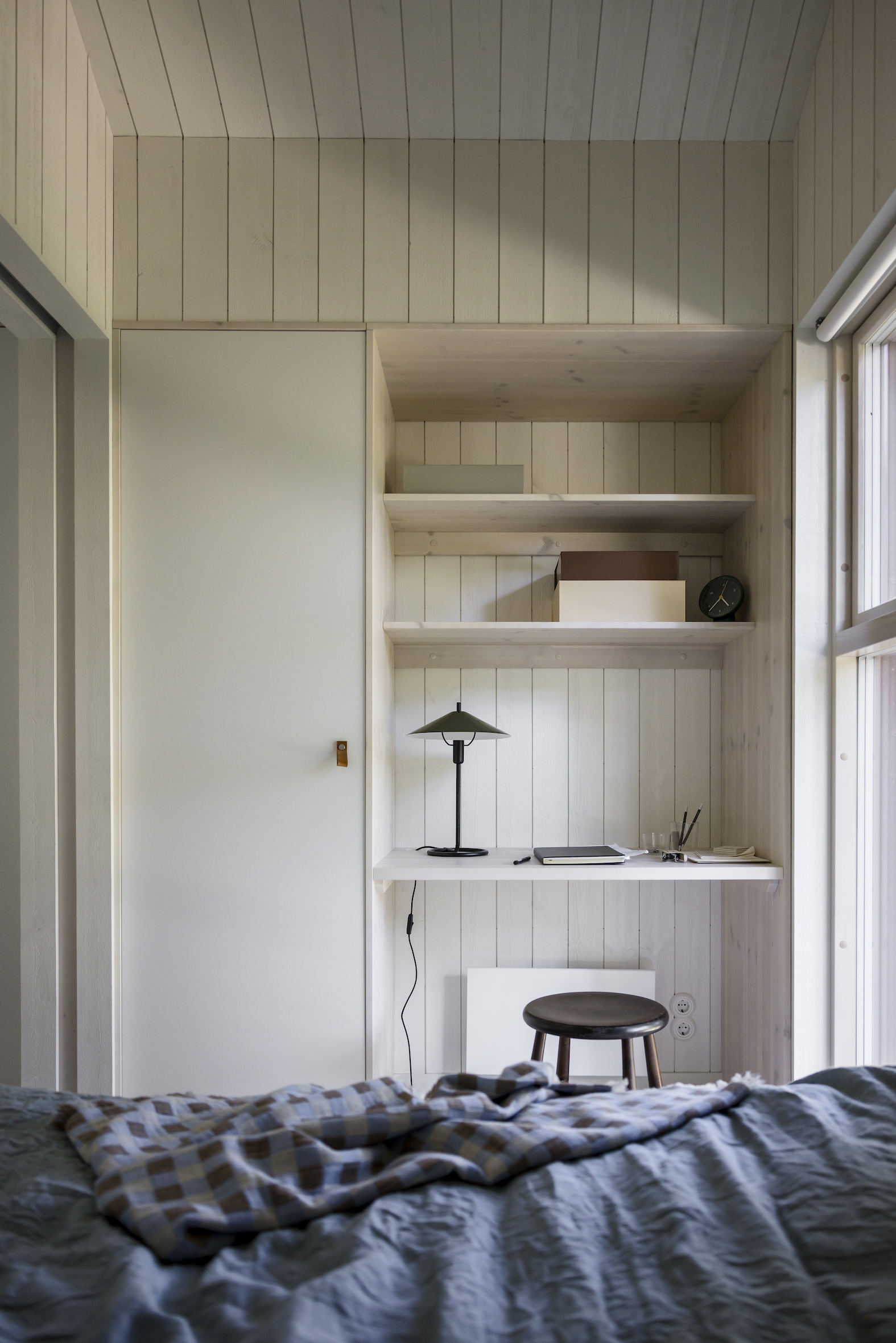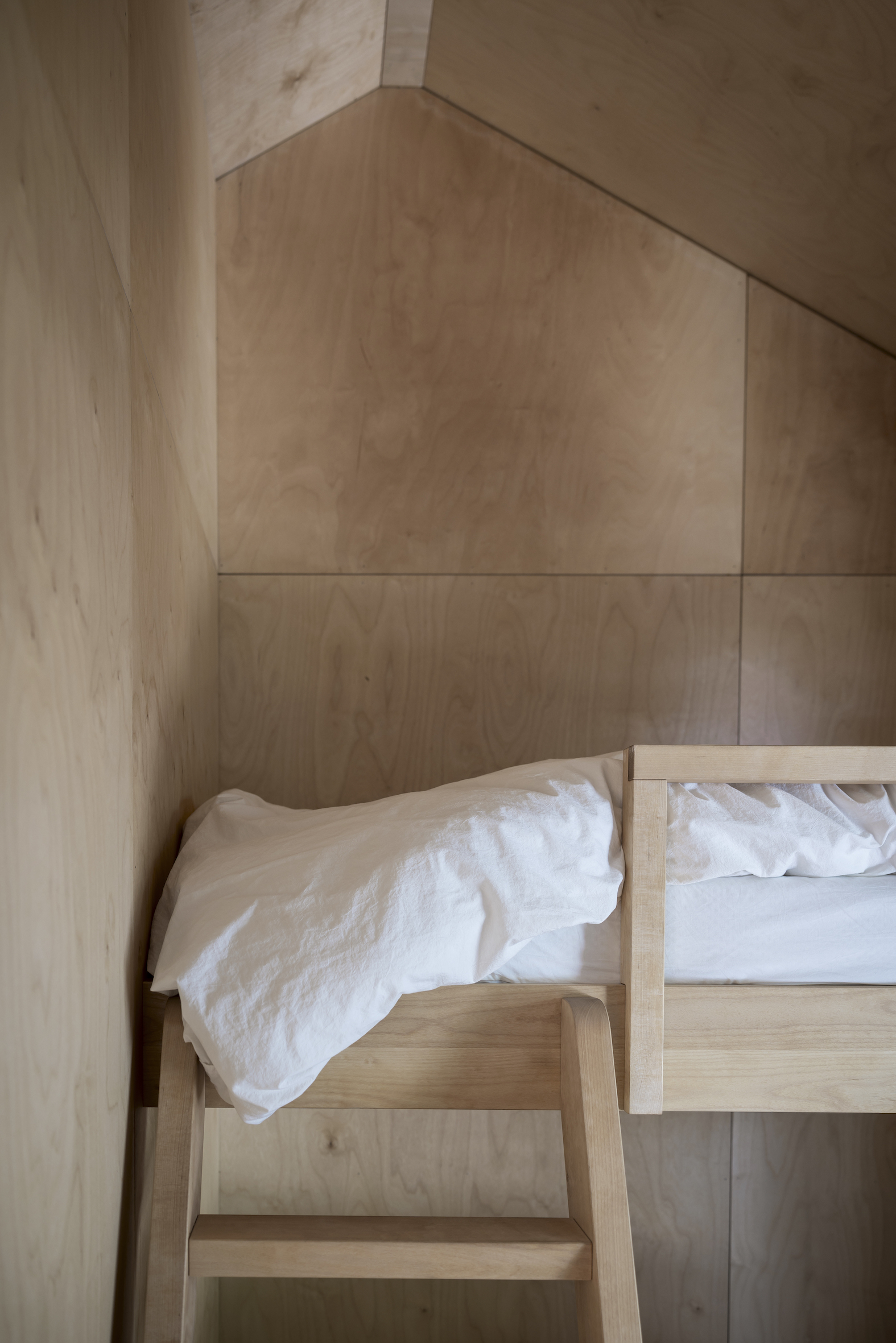 Huset har interiörstil Rå med vägg och tak i björkplywood behandlad med mattlack. På golvet ligger en massiv borstad furutilja behandlad med naturlig hårdvaxolja. Köket i mattlackad björkplywood med luckor och lådfronter i järnoxidsvart.