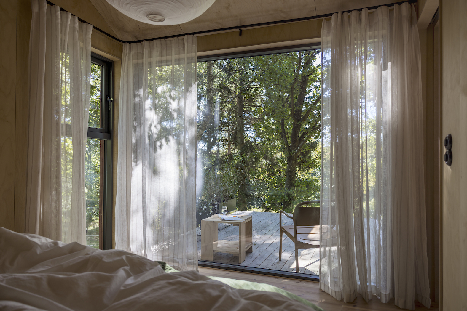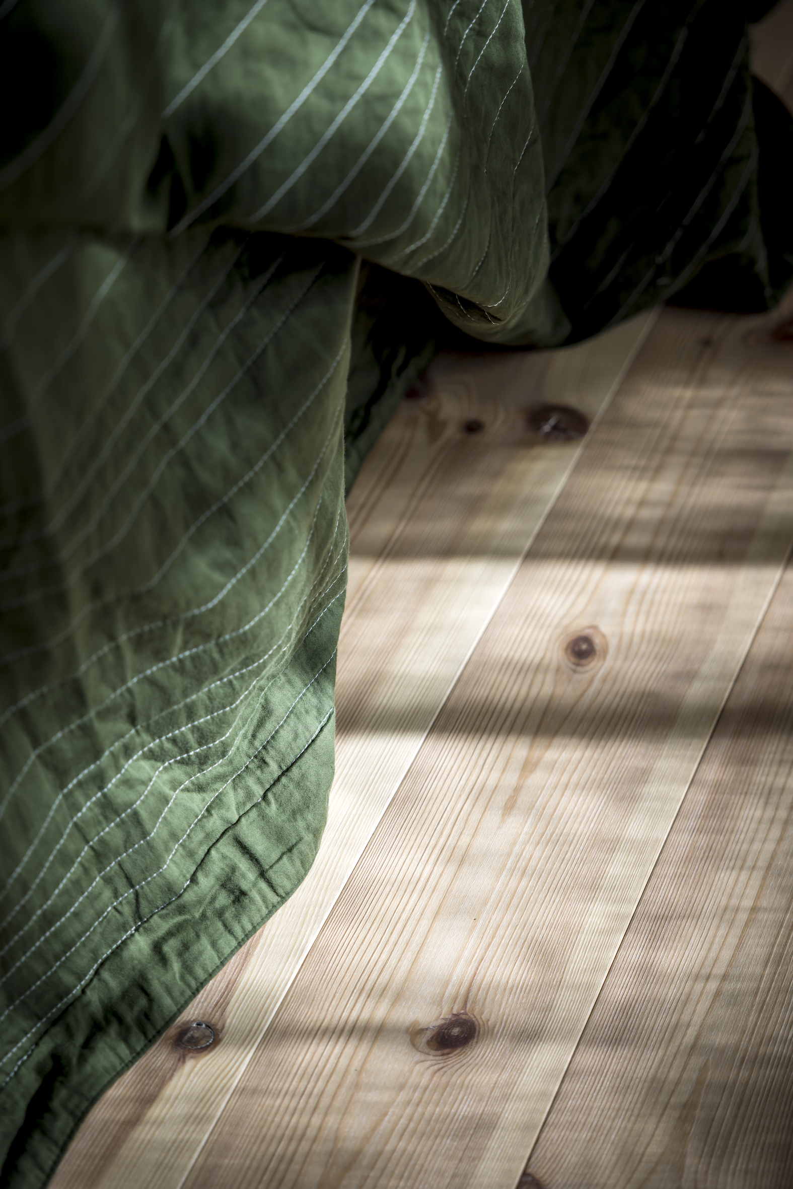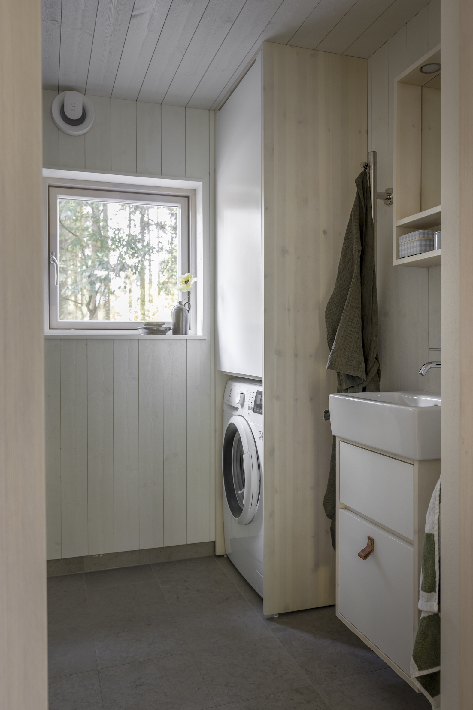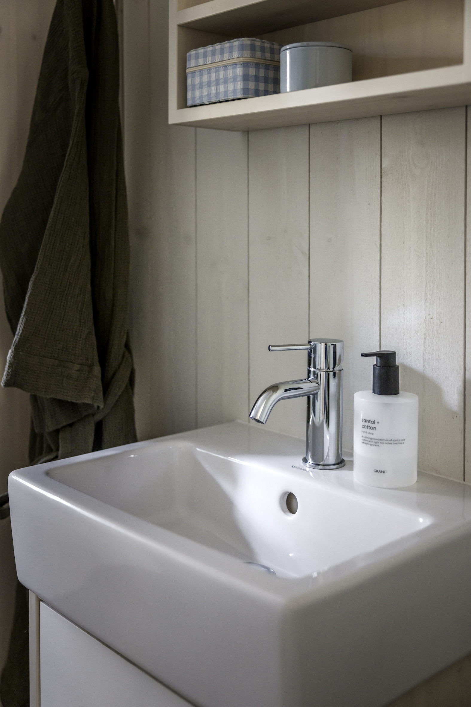 Attefallshuset är inrett med vår originalinteriör, Lugn, med ljusa och massiva material. Vitvaxade trägolv, snickerier och kök ger en somrig känsla. Finsågade paneler på innerväggar och tak ger atmosfär. I badrummet möts ljust trä och granitkeramik i toner av kalksten.
