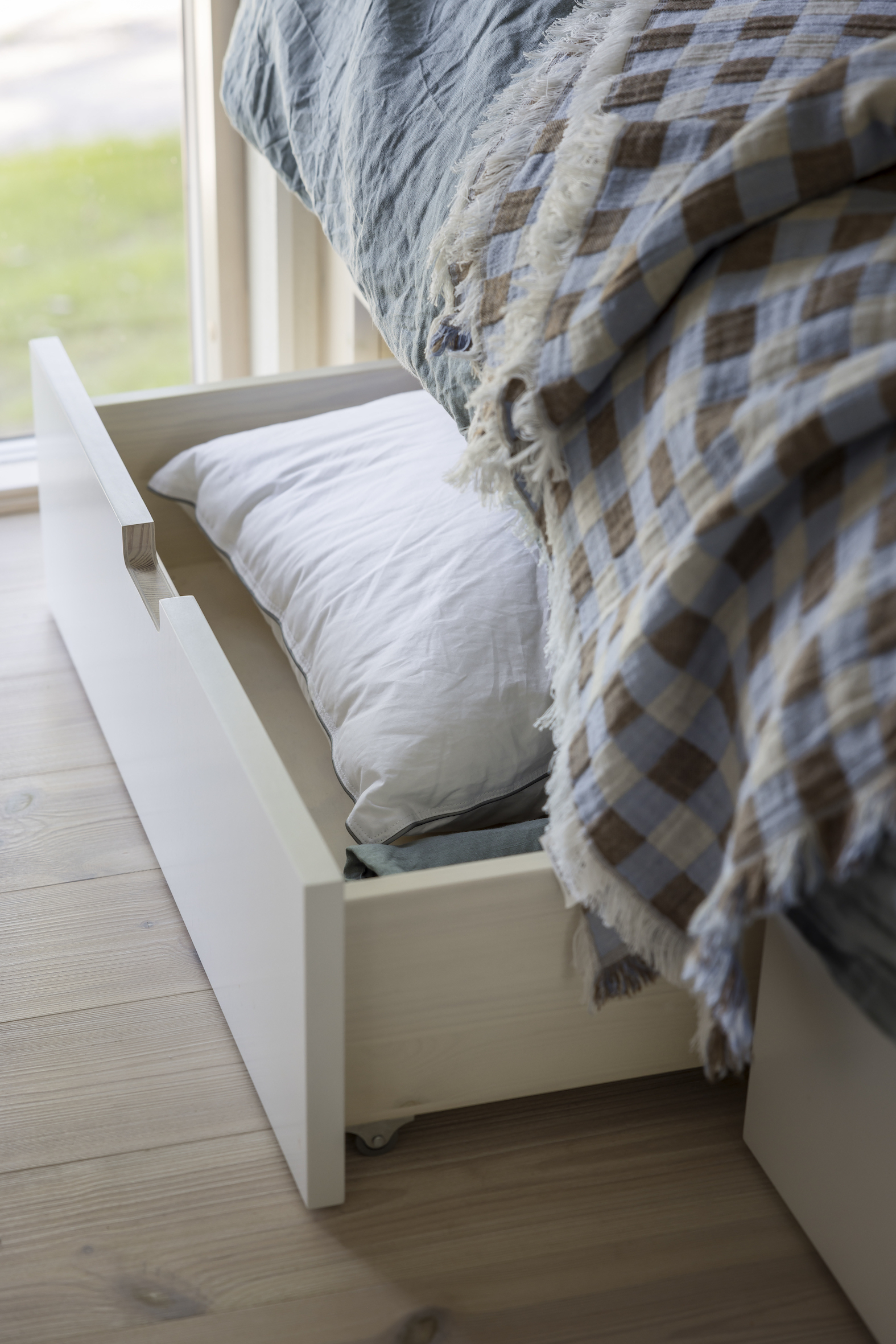 I sovrummet finns en platsbyggd dubbelsäng med förvaring i lådor under. Samt garderober och ett skrivbord med öppna hyllor. Det finns även ett badrum med wc, dusch och tvättmaskin. Naturligtvis uppfylls alla krav som ställs på komplementbostadshus enligt den nya lagstiftningen.